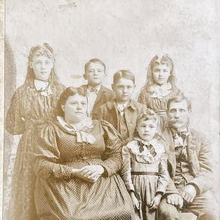 This photos is from approx. 1910. This is the second photo of the Shuler family in the collection. Henry C. Shuler sits in front with John Jasper Shuler, and Hannah Lucetta Shuler (nee Dow) is on the right. Henry and Hannah are Sweetie's maternal grandparents. Standing in an arc behind them are (from left to right): Cordia Belle Shuler, William Henry Shuler, Laura Kathryn Shuler (Sweetie's mother), Lorenzo Clark Shuler, and Sarah Rosanna Shuler (Sweetie's "Aunt Rosanna"). As this photo is dated approx. 1910, Laura (Sweetie's mother) is approx. 24 years old.